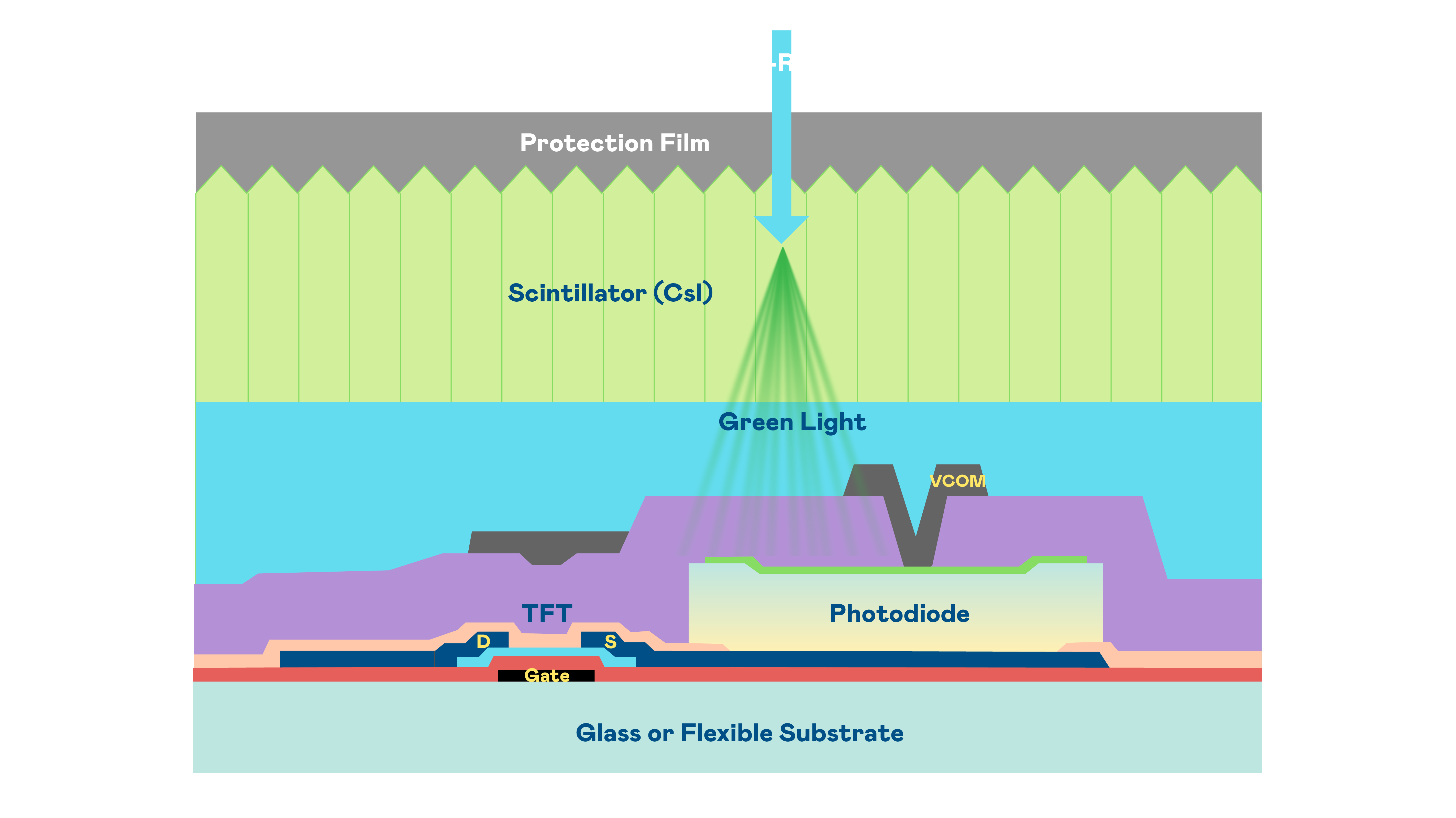 AG电子的X光影像感测阵列使用薄膜电晶体 (TFT) 作为每个像素的读取开关,搭配光电二极体(Photodiode)的光电转换元件,用以感测X光影像讯号。